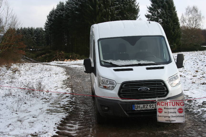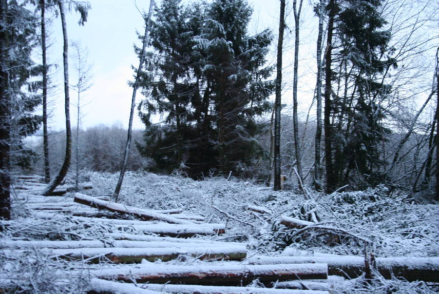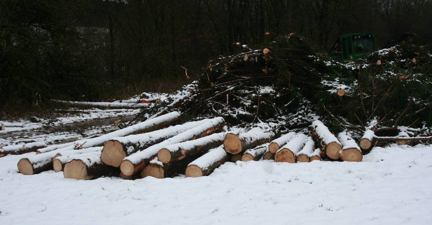 Sehr viel einfacher wären die Arbeiten bei strengem Frost mit festem Untergrund, der ist aber zur Zeit leider überhaupt nicht in Sicht ist und Ende Februar ist das Zeitfenster dann wieder zu. Deshalb werden die ersten Blöcke jetzt vor allem von den festen ehemaligen Panzerwegen aus bearbeitet.