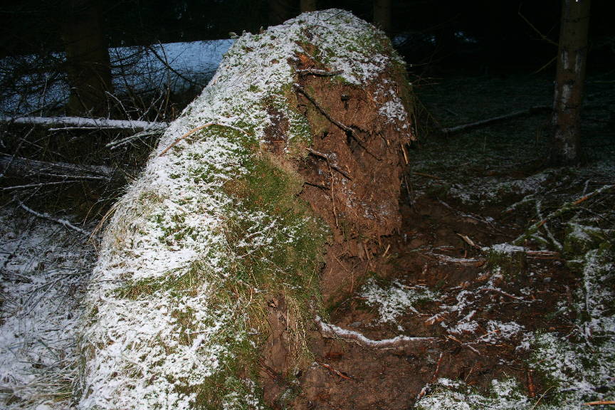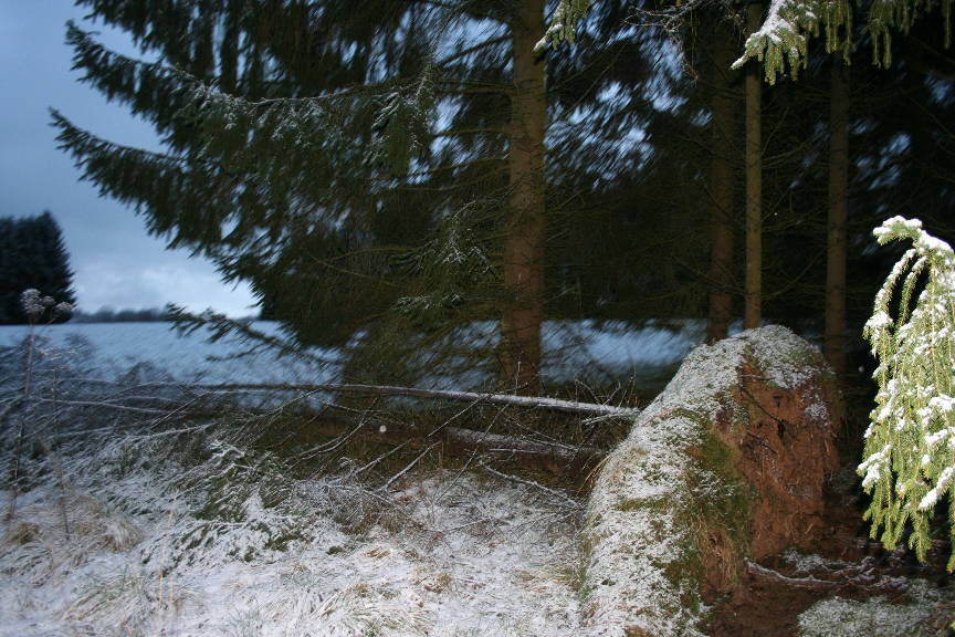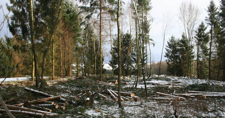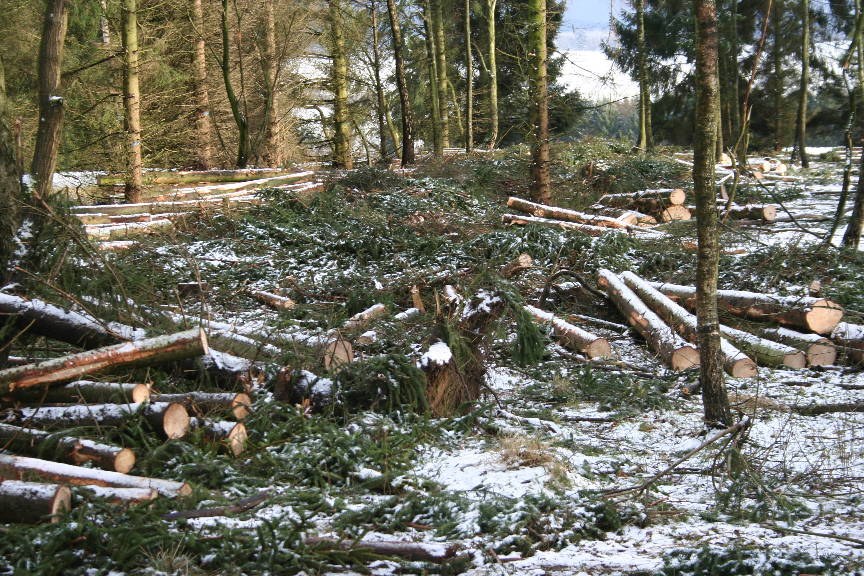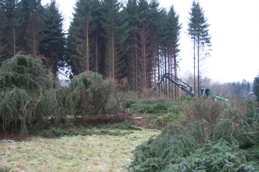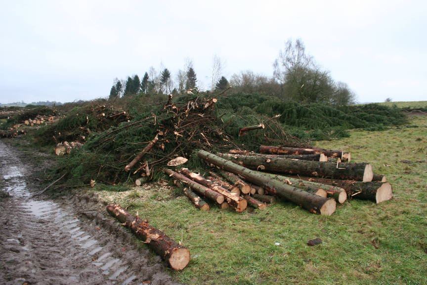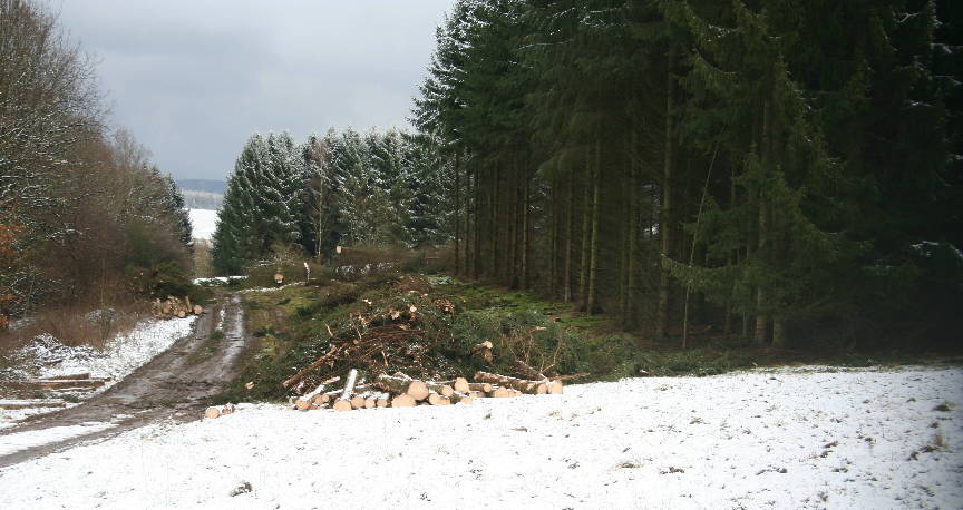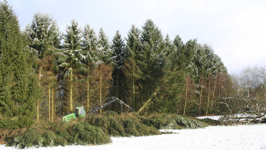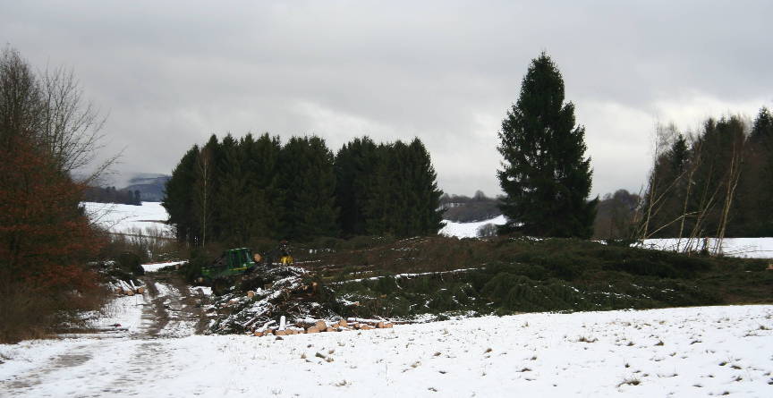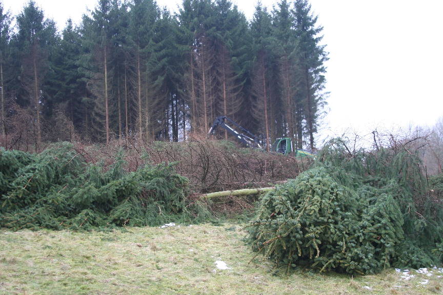 Bei der jetzigen Maßnahme werden kleine Fichten-Blöcke vollständig geräumt, damit sie in Zukunft – von Schafen beweidet – Grünland werden können. Hierzu muß möglichst viel Holzmaterial (auch Kronen und Zweige) von den Flächen geschafft werden.