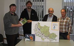 Rainer Scholz, Wolfgang Rackow, Norbert Südhoff und Fritz Ahrens bei der Übergabe der auf einer Karte zusammen gefassten Eisvogel-Beobachtungen (v.l.n.r.)