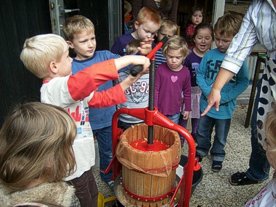 Apfelsaftpresse. Mit Begeisterung führten sie die einzelnen Arbeitsschritte unter Anleitung der Erzieherinnen selbst durch.