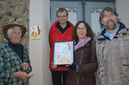 Reiner Deichmann und Wolfgang Rackow vom NABU überreichen Pastor Stefan Schmidt und Silke Winkler (Bildmitte) Urkunde und